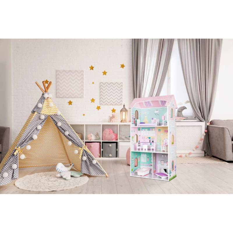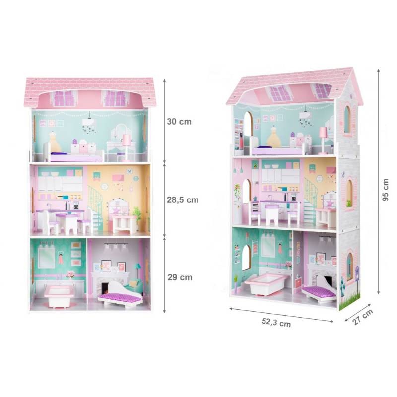 Konstrukcija kuće je od drveta i medijapana. Unutrašnje ilustracije na zidovima. Kuća je podeljena na 4 različite prostorije: kupatilo, dnevni boravak, kuhinja i spavaća soba. Svaka soba ima poseban namještaj: kadu, krevet, sofu, sto sa stolicama, komoda i lampu. Svi drveni elementi su ofarbani bojom koja je bezbjedna za djecu. Kuća za samomontažu prema jasnim uputstvima.