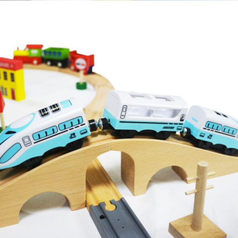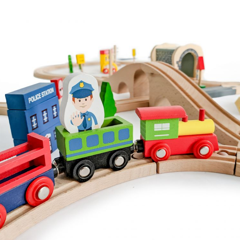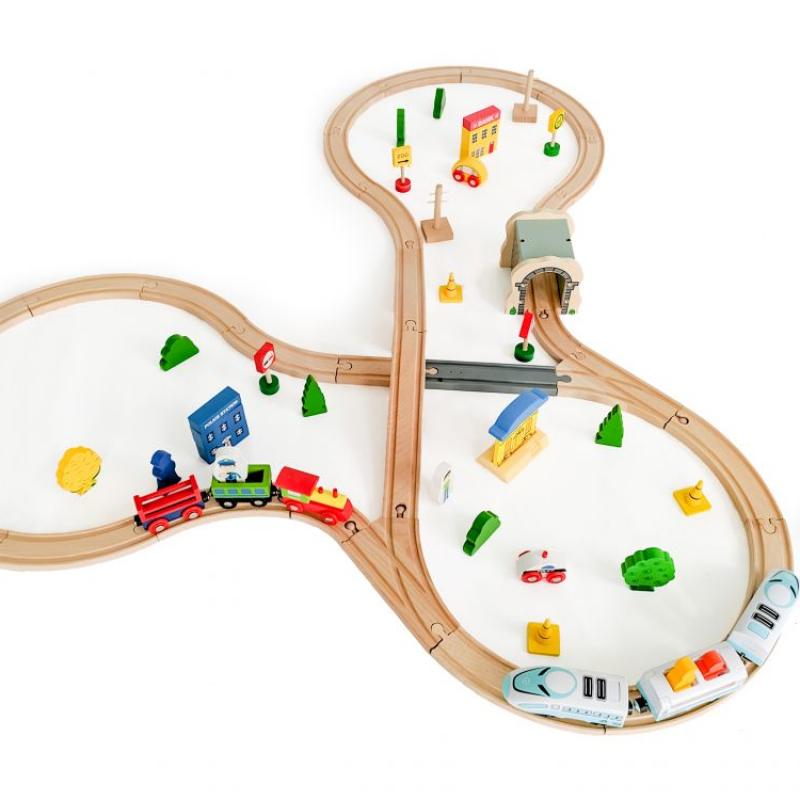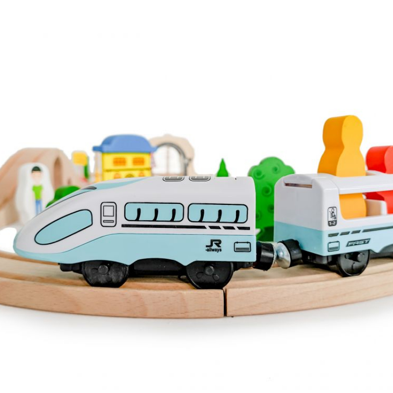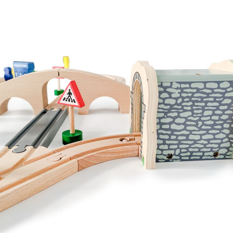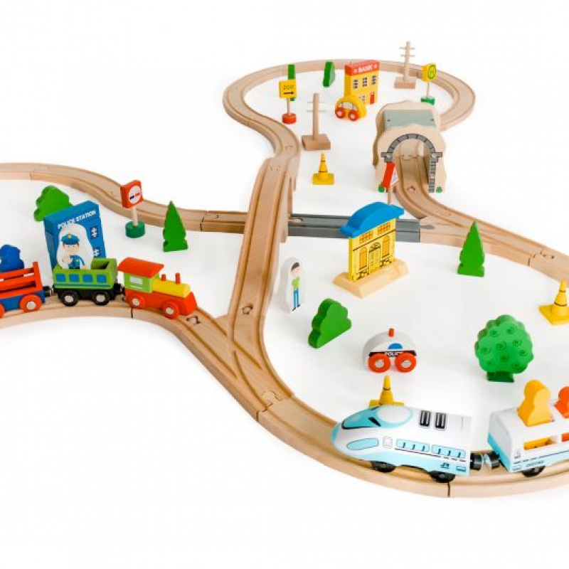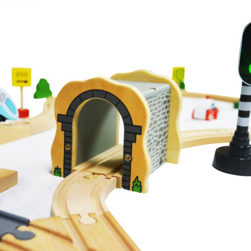 Gusenice su napravljene od punog drveta. Red ima mnogo iznenađenja: poseban kolosjek koji čuje zvuk voza i radni semafor. Komplet se sastoji od ukupno 69 elemenata, uključujući, između ostalog: staze, figurice, žbunje, drveće, zgrade, automobil, itd. Komplet uključuje električnu lokomotivu na baterije. Trake se mogu povezati sa vozovima drugih brendova