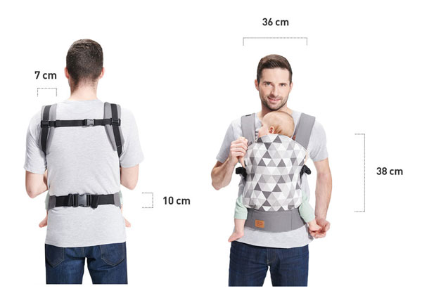 Podesivi pojasevi smanjuju pritisak na leđima roditelja. Veoma jednostavno podesite položaj koji će odgovarati vama i vašoj bebi. Prilagodljiv pojas za kukove širine 10 cm garantuje udobnost jer je napravljen od guste pjene. Sistem elastične kopče doprinosi skraćivanju dugih pojaseva.