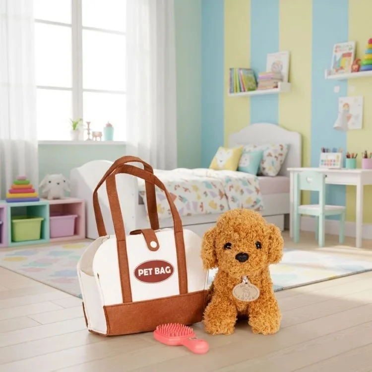 Plišani pas dolazi sa torbom za nošenje i četkom za njegu, čineći funkcionalan set namijenjen djeci starijoj od 3 godine. Torba je kompaktna i lagana, što omogućava djetetu da lako nosi plišanog psa kod kuće, u vrtiću ili na kratkim izletima. Uključena četka omogućava djetetu da njeguje psa, učeći ga odgovornosti i brizi.